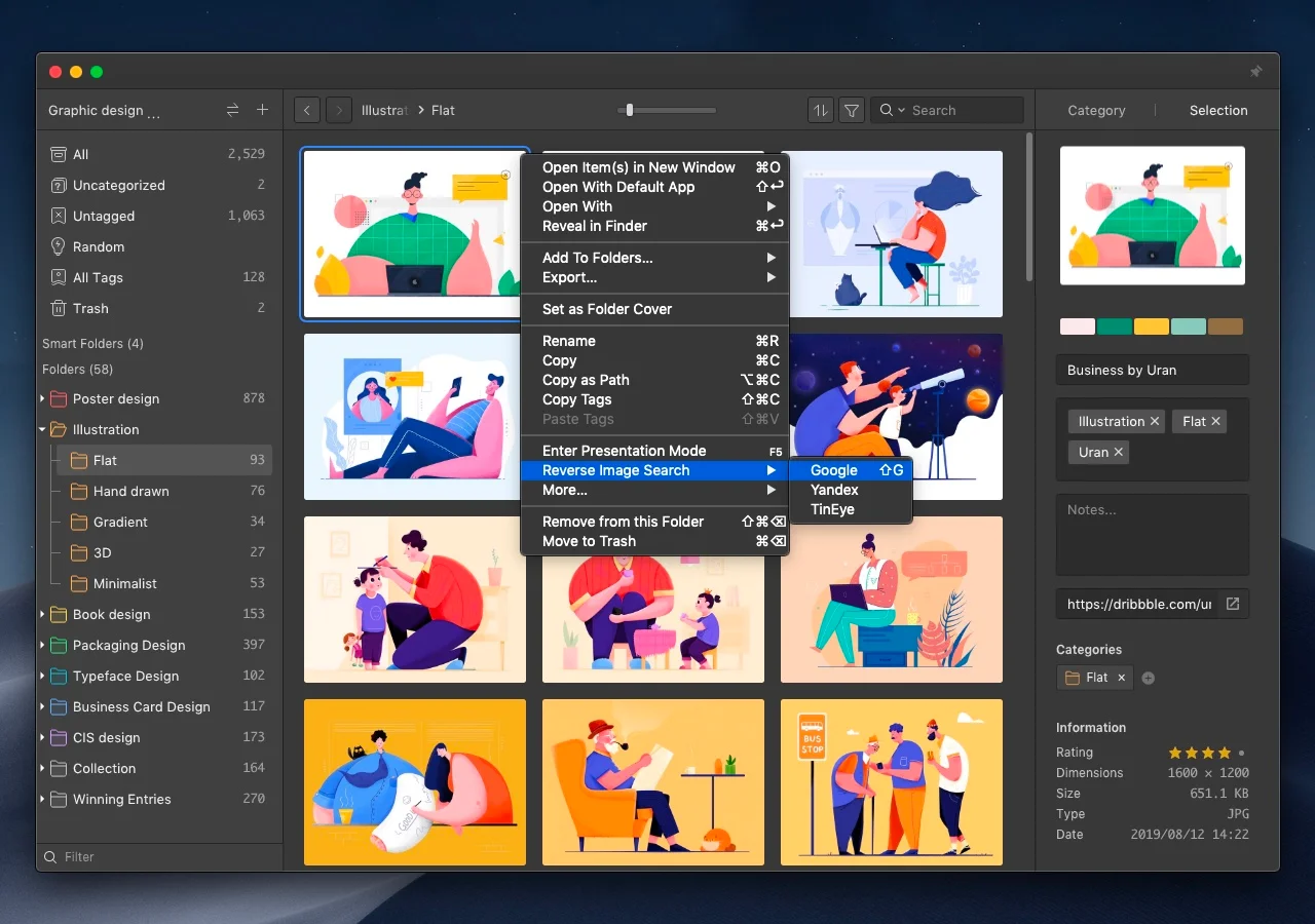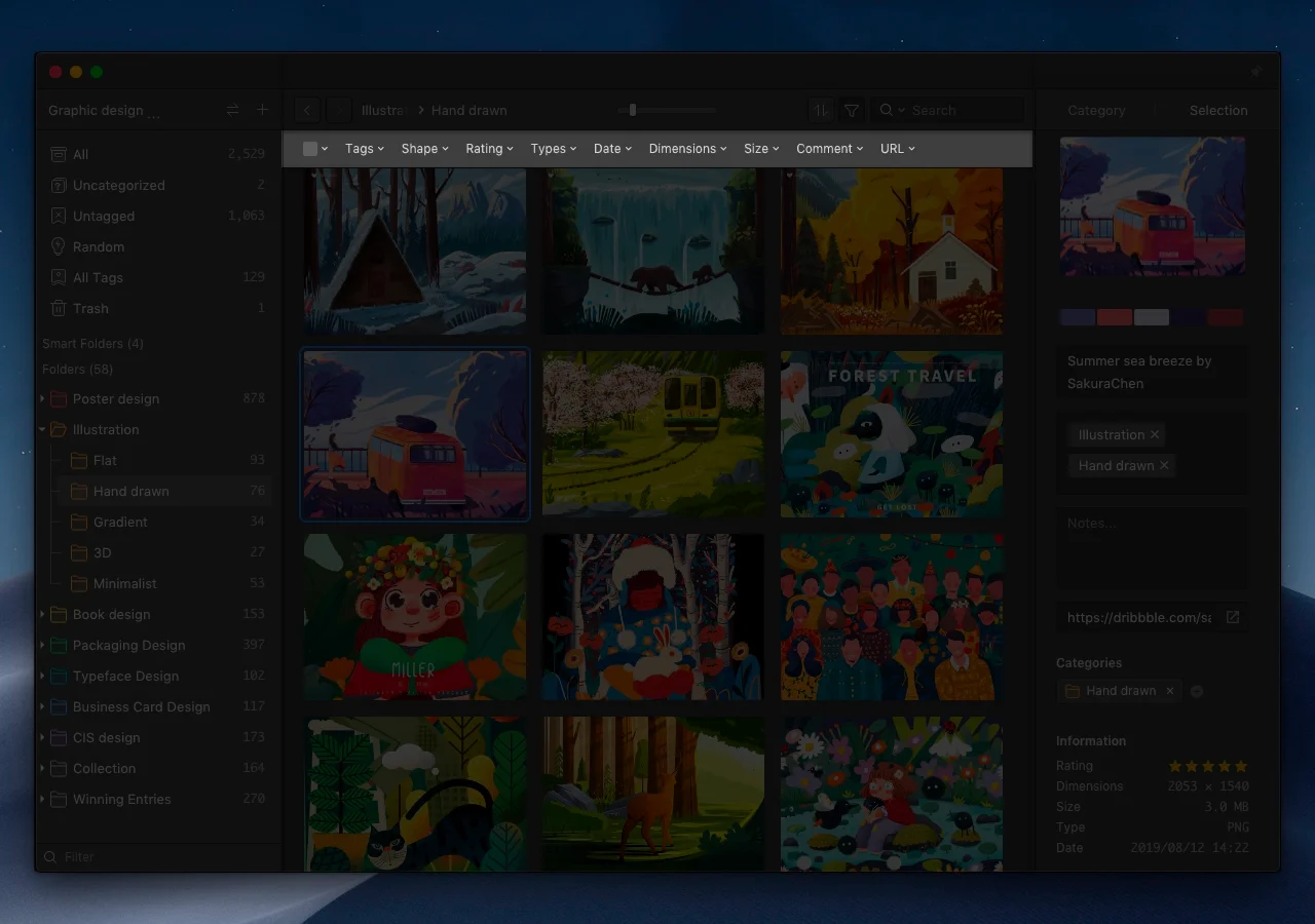 Eagle provides multiple methods to help you categorize all the files, including tagging, annotating, batch-renaming, or even color filtering. You can categorize the pictures into different folders hierarchically depending on their uses or meta information.