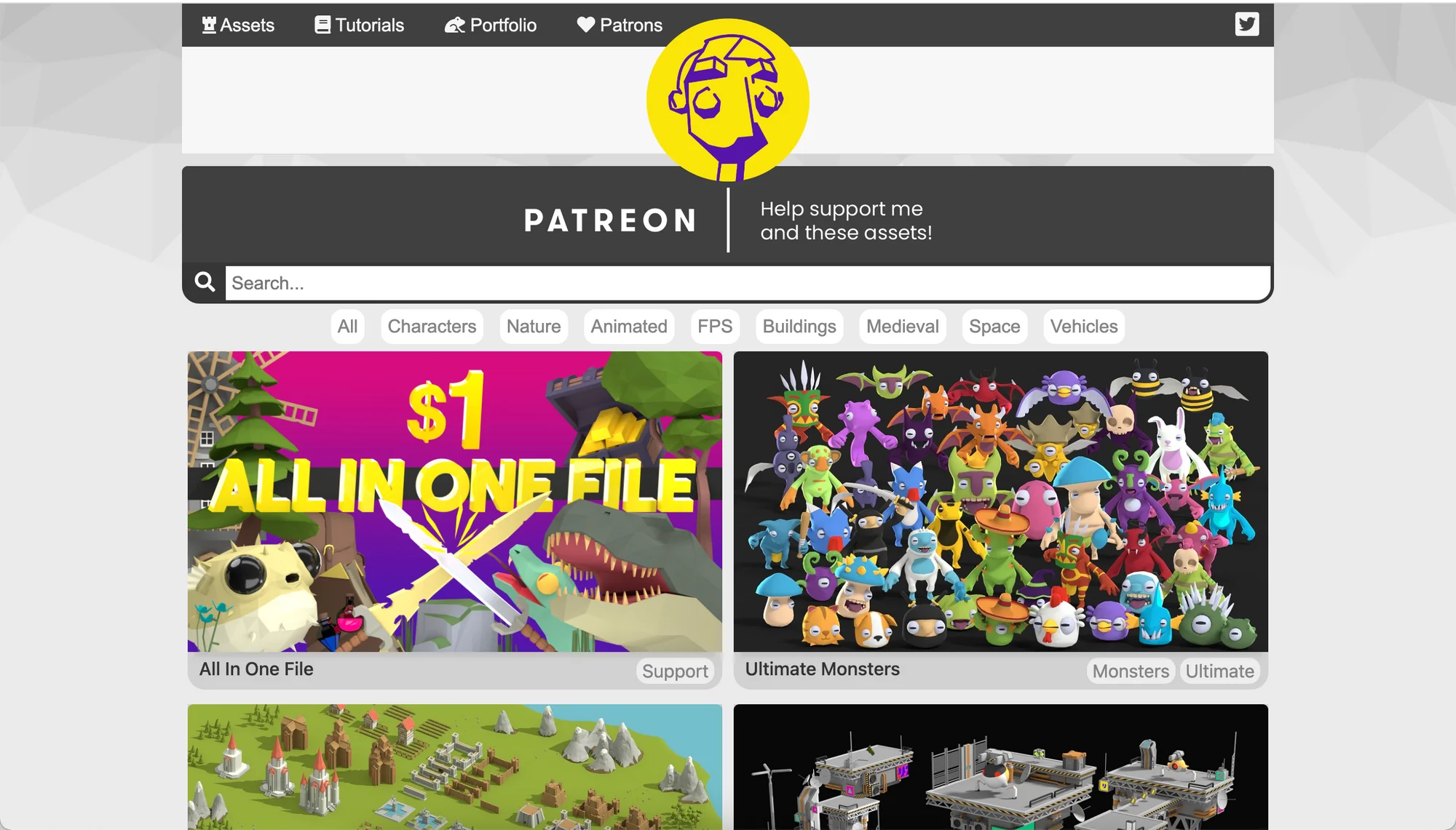 It contains more than 500+ assets like characters, nature, animated, FPS, buildings, medieval, space and vehicles some of them you are able to download in FBX, OBJ, glTF and Blend formats!