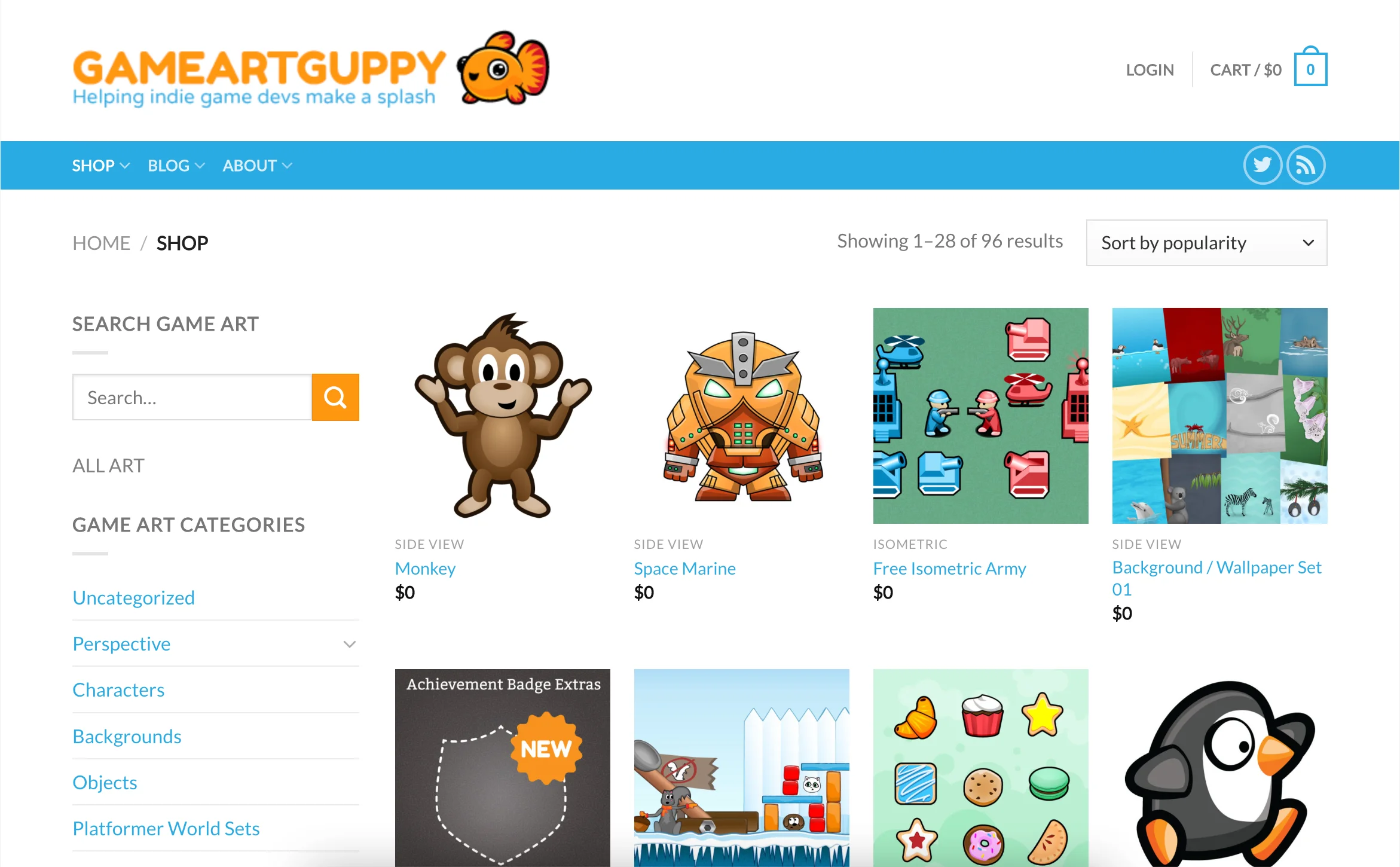 GameArtGuppy was created by Vicki Wenderlich to give game devs who can't afford custom art (yet) an easy way to find and use free and inexpensive art. Choose from dozens of characters, game backgrounds, and more to make your game unique!