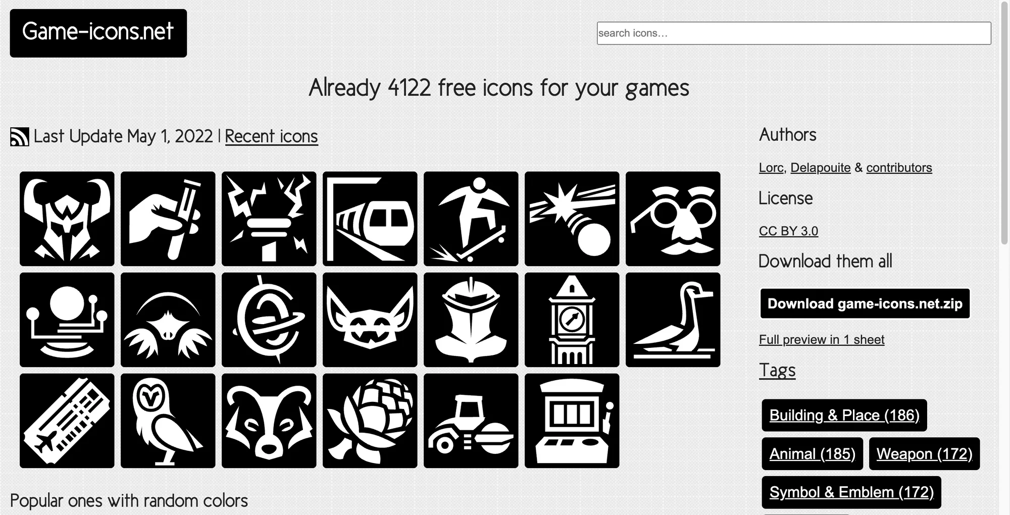 All the game icons here are free to use in your projects. It updates regularly, all the images are downloadable in a vector format, so you can easily tweak colors, rotation, adjust effects like blur, bevels or shadows and add badges.