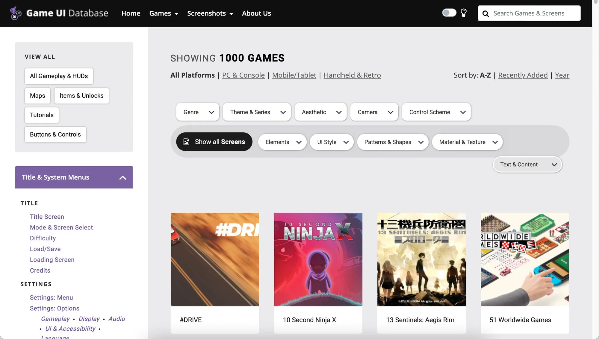 Game UI database is created as a free resource for UI/UX Designers in the games industry. It is built to aid in the discovery of new inspiration, and to provide a fast and efficient way of searching for reference materials till date it have over 1000 games with 42292 screenshots available to aspire your game design!