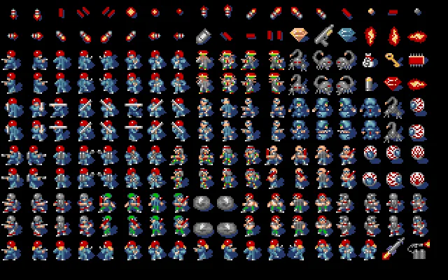 You can find over 100 game assets such as animations, buildings, characters, interfaces, items, projectiles, tiles, vehicles and weapons, you are allow to use freely as long as you give credit.