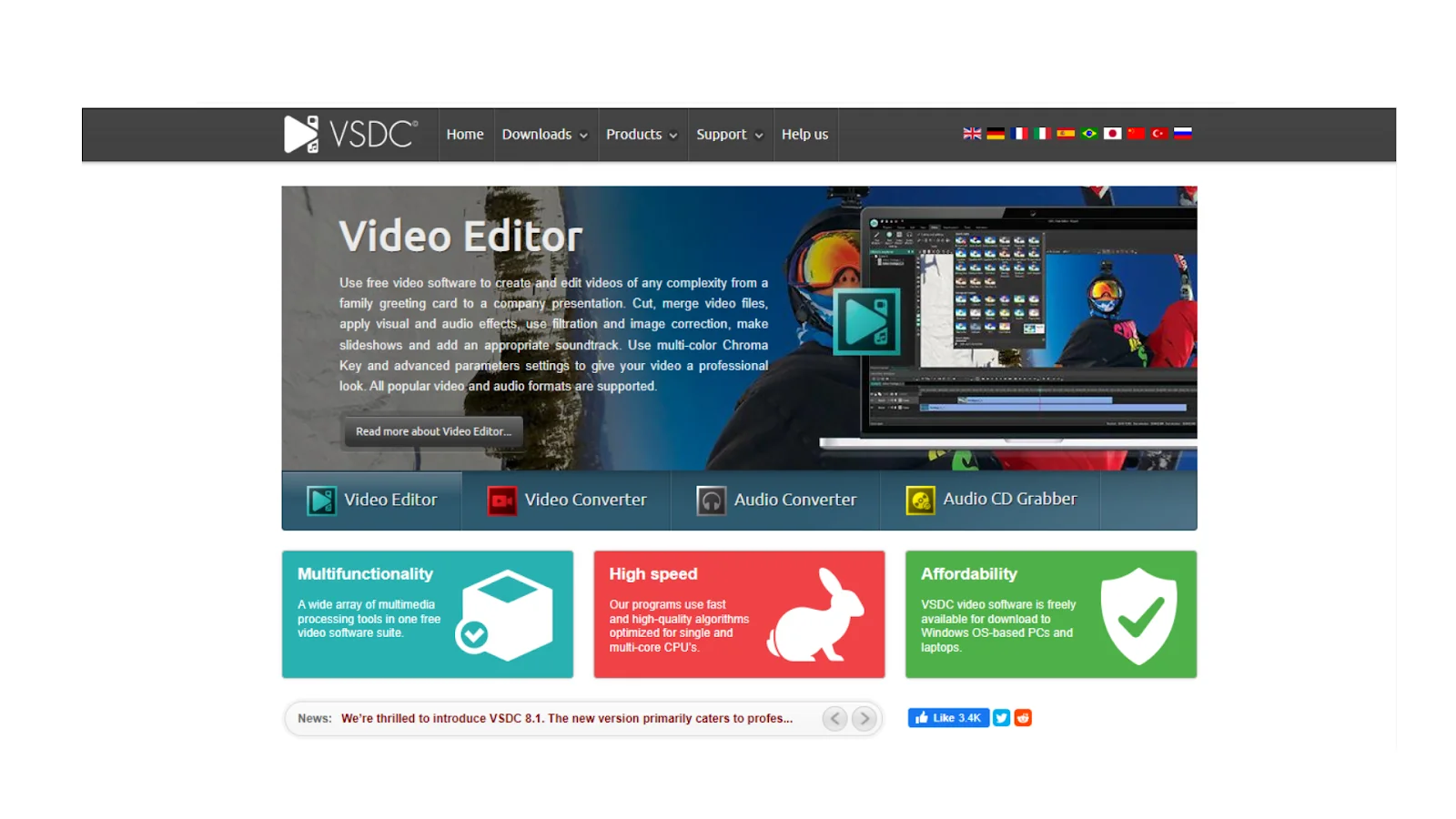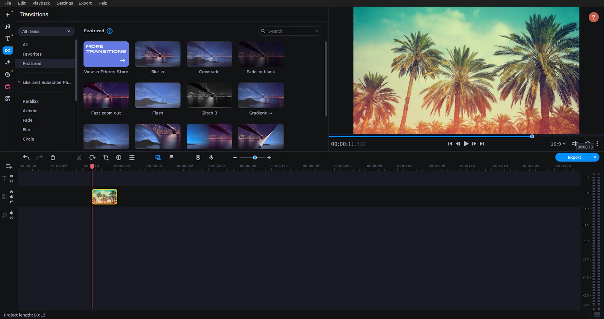 - Provides a range of video transitions, color grading tools, and special effects
